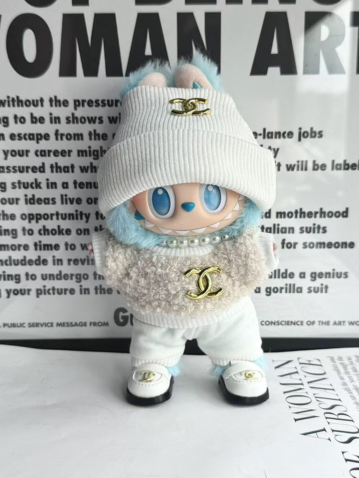 LABUBU Clothes Chan*l Knit Hat & Furry Sweater Outfit