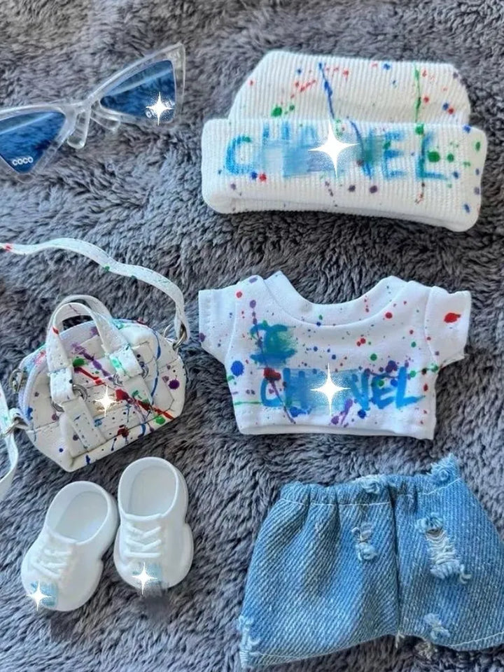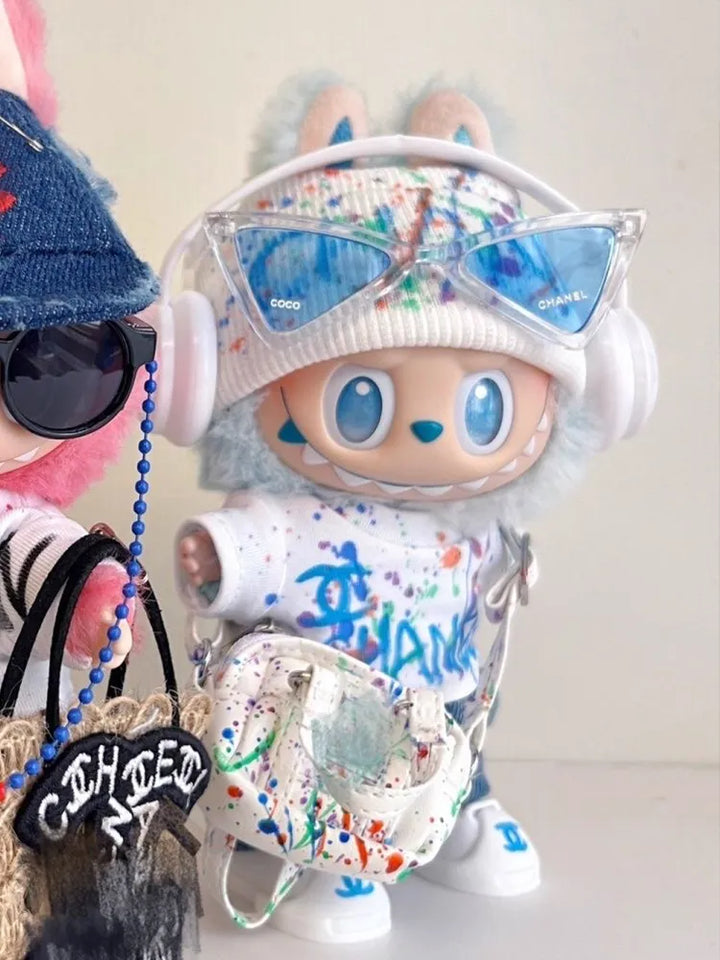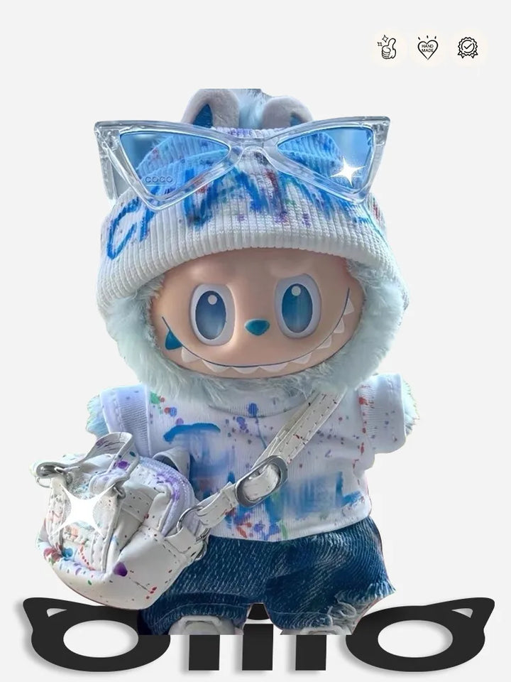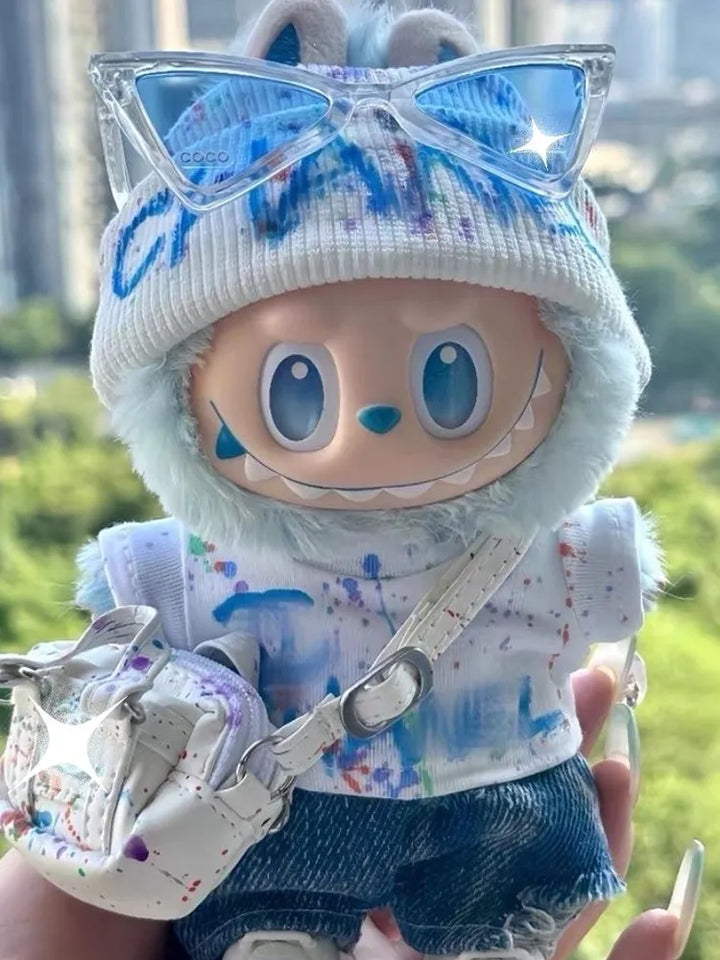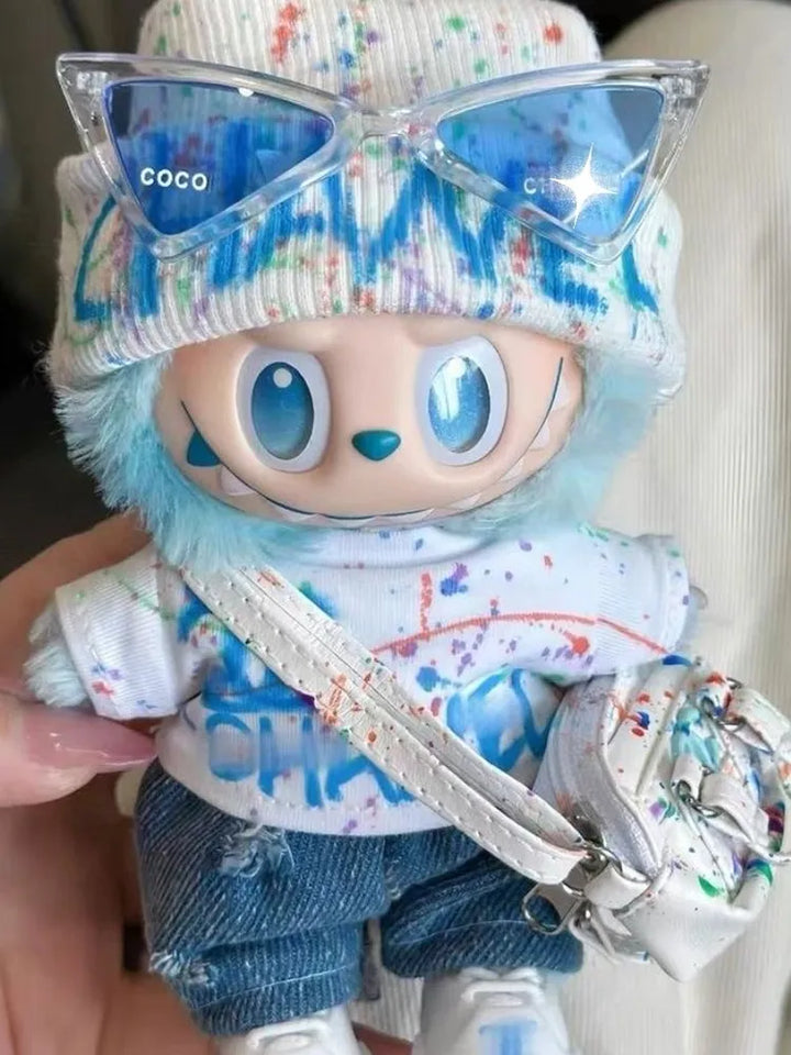 Labubu Clothes Chan*l Splashy Art White Blue Outfit